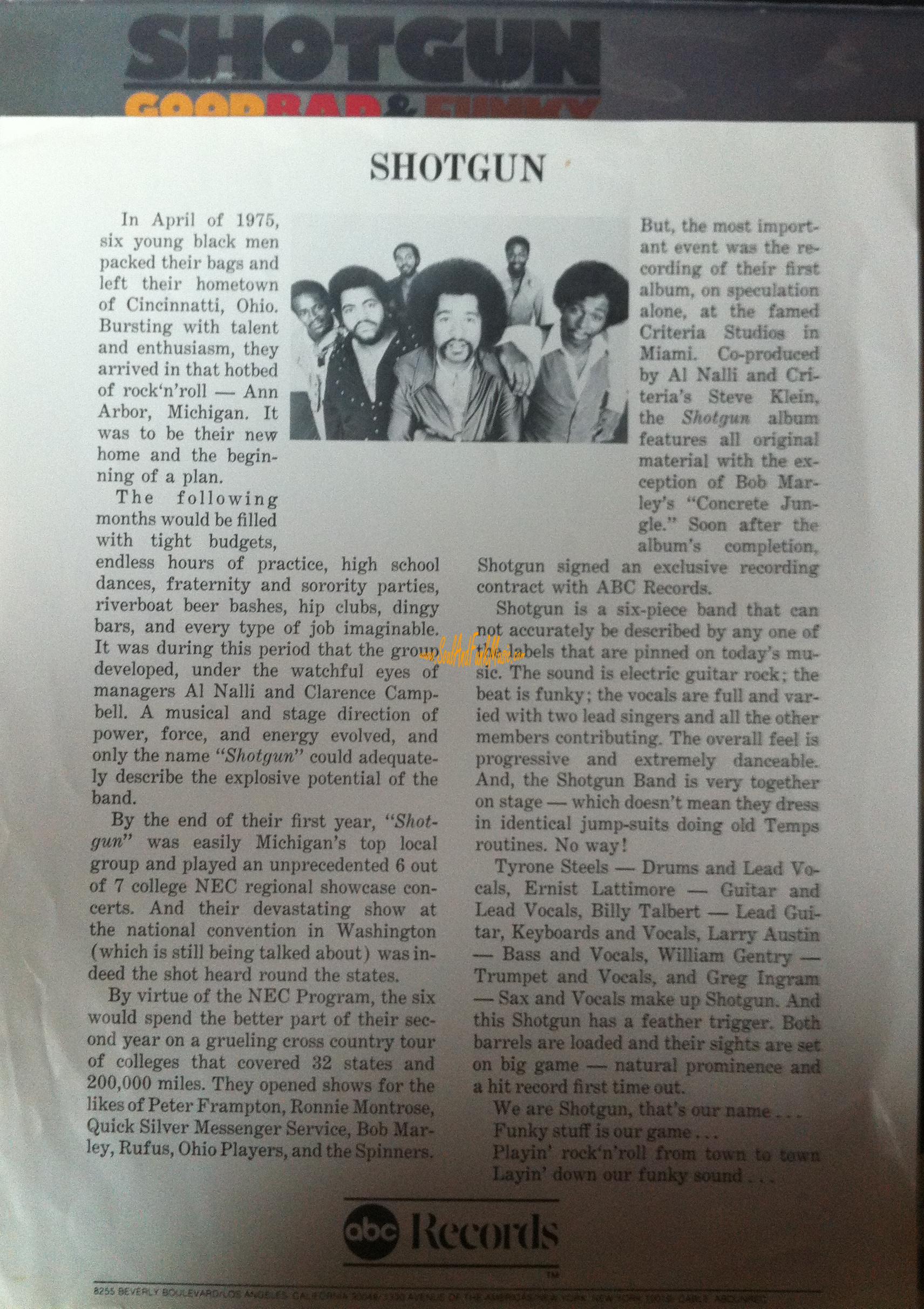 They opened shows for the likes of Peter Frampton, Ronnie Montrose, Quick Silver Messenger Service, Bob Mar- ley, Rufus, Ohio Players, and the Spinners. But, the most import* ant event was the re* cording of their first album, on speculation alone, at the famed Criteria Studios in Miami. Co-produced by Al Nalli and Cri- teria's Steve Klein, the Shotgun album features all original material with the ex- ception of Bob Mar- ley's "Concrete Jun- gle." Soon after the album's completion, Shotgun signed an exclusive recording contract with ABC Records.
