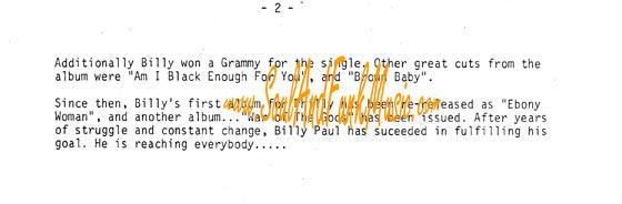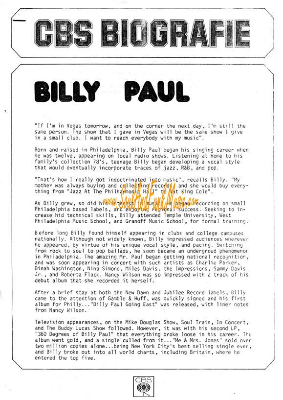 [Back] Billy Paul▶ Bio Add/Complete Bio Appearances Jean Carne - Love Lessons (1997) (Performer) Articles and Documents Original CBS Biography Billy Paul Original CBS Biography Billy Paul (Pt. 1) Billy Paul Wins $500K in Dispute With Gamble & Huff