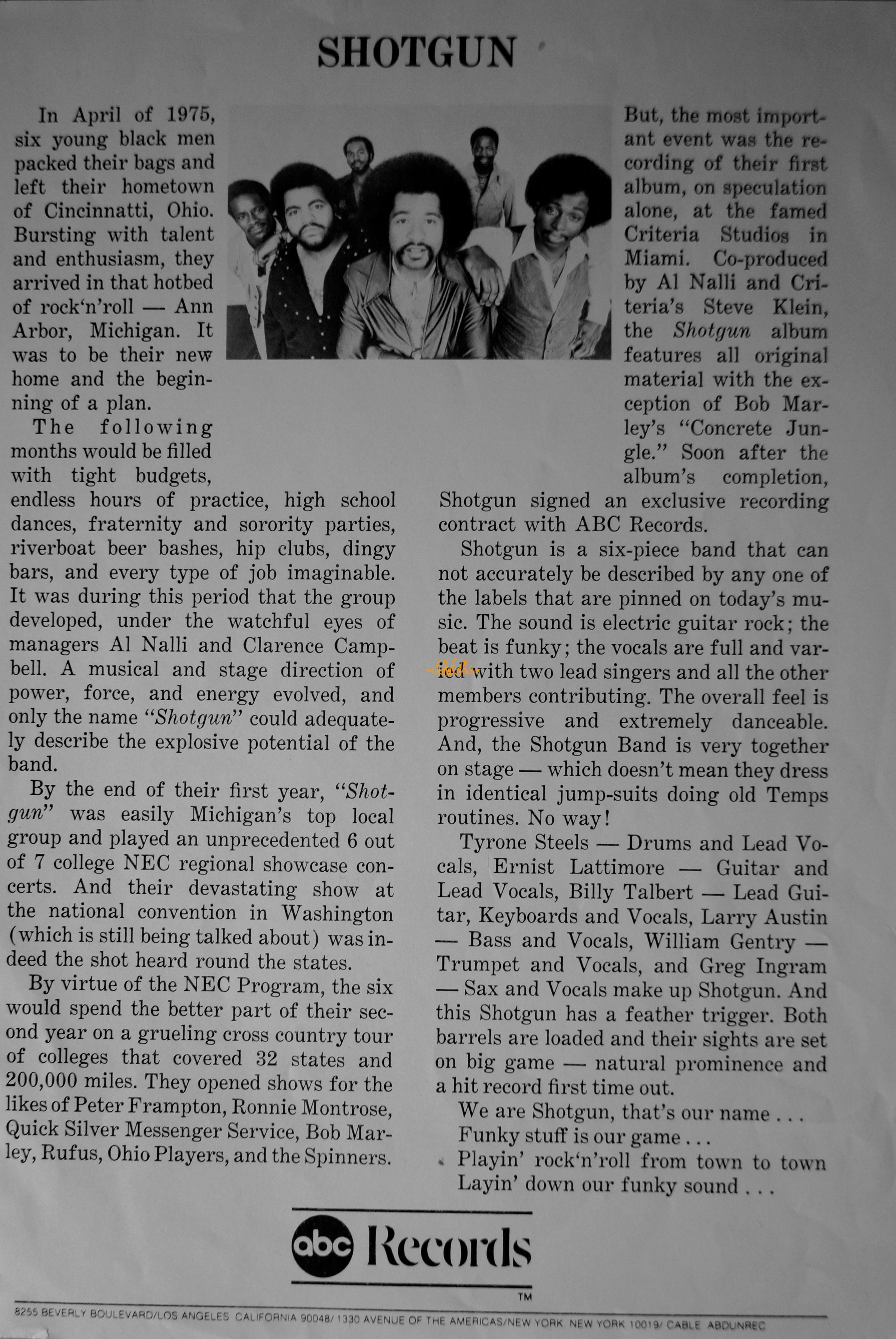 They opened shows for the likes of Peter Frampton, Ronnie Montrose, Quick Silver Messenger Service, Bob Mar- ley, Rufus, Ohio Players, and the Spinners. But, the most import* ant event was the re* cording of their first album, on speculation alone, at the famed Criteria Studios in Miami. Co-produced by Al Nalli and Cri- teria's Steve Klein, the Shotgun album features all original material with the ex- ception of Bob Mar- ley's "Concrete Jun- gle." Soon after the album's completion, Shotgun signed an exclusive recording contract with ABC Records.