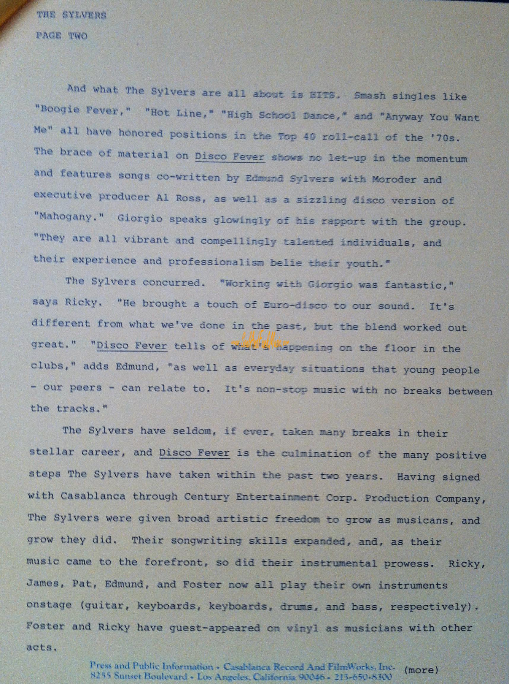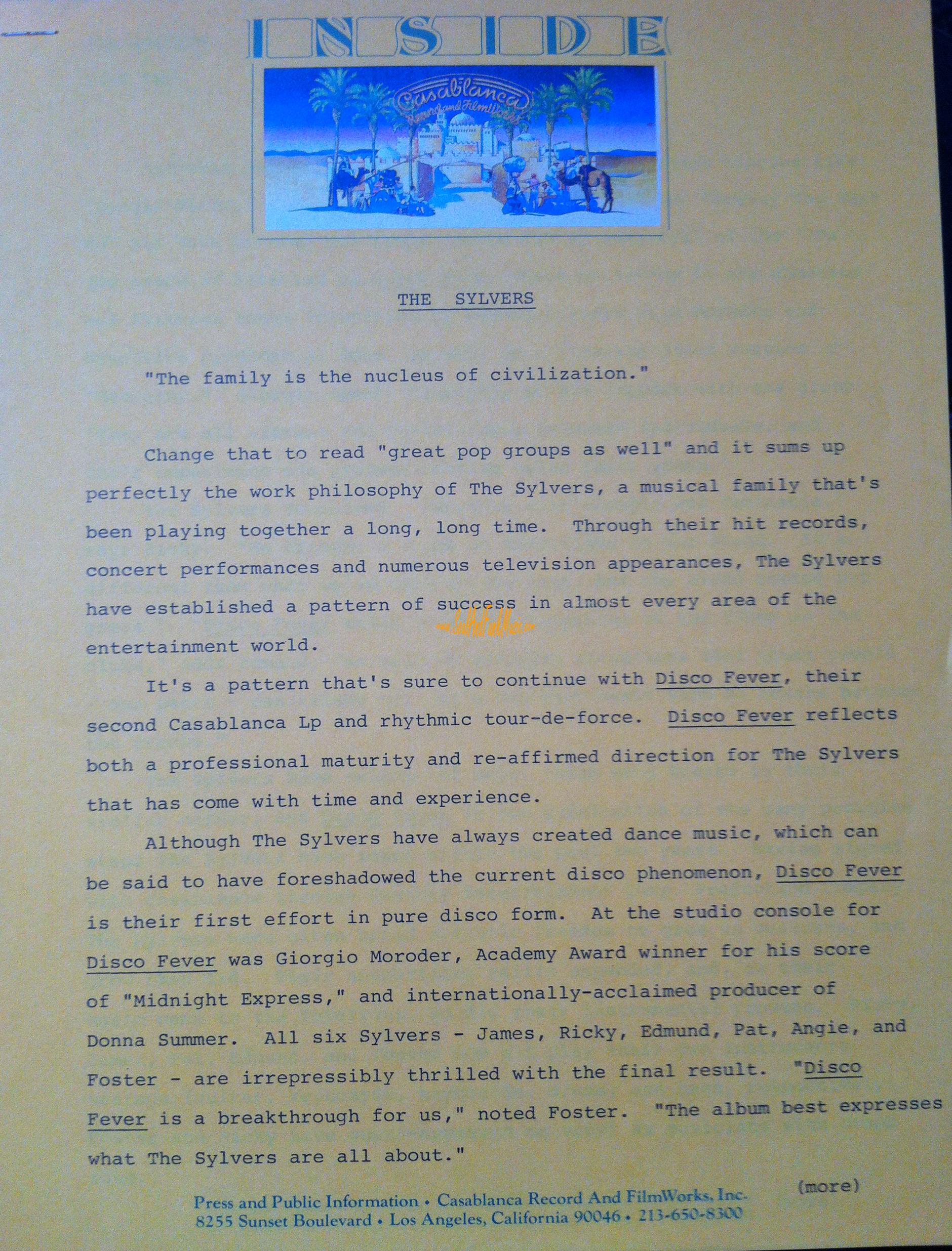 They also have a number of titles in their back catalog, starting with The Sylvers (1972) on the Pride label, The Sylvers 2 (1973), and The Sylvers 3 (1974) on the MGM label. Major success came with the 1975 release of Showcase on Capital Records, which included Boogie Fever. Next was Something Special (1976), New Horizons (1977), Forever Yours (1978) on Casablanca Records, and Disco Fever (1979). By this time, Foster Sylver was the lead vocalist, and played bass on some songs as well. Concept was released in 1981 on Solar Records, where Leon now is a record producer. Their final LP, Bizarre, was issued on Geffen Records in 1984.